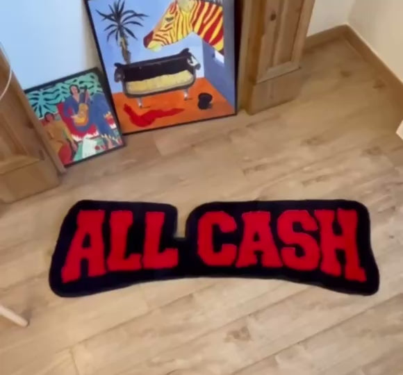Measuring a versatile size, this rug is perfect for individuals who seek modern and trendy decor, those with an affinity for making a statement, or anyone looking to add a vibrant touch to their living space. The tufted design, with its striking red and black color combination and the impactful "All Cash" quote, turns your space into a haven of modern charm and a tribute to urban aesthetics.